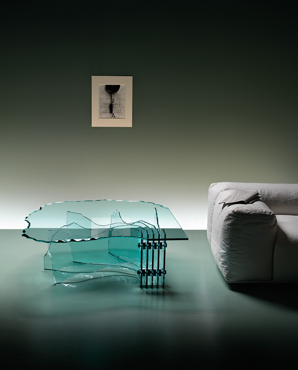table with hand-sculpted glass top Shell.