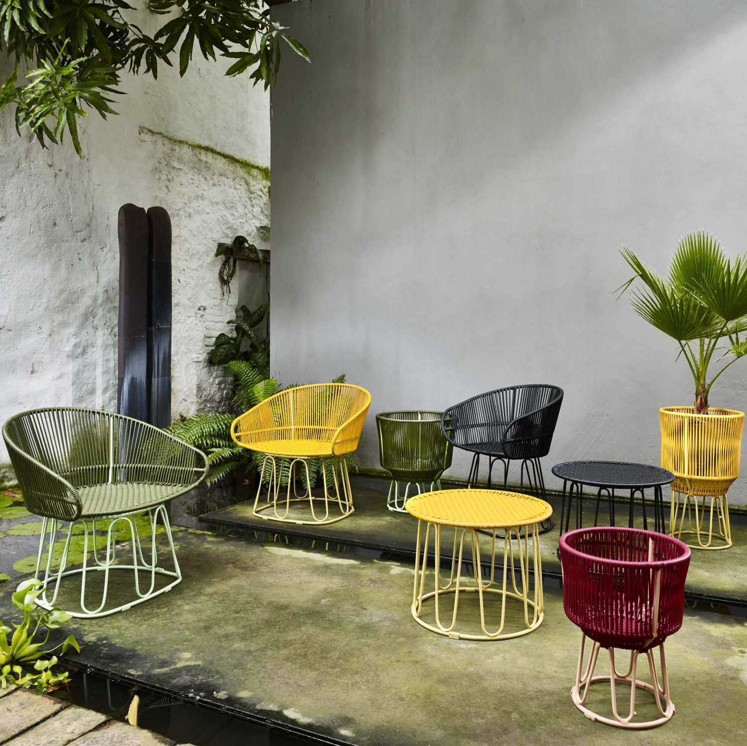 from powder-coated tubular steel and colourful synthetic weave suitable