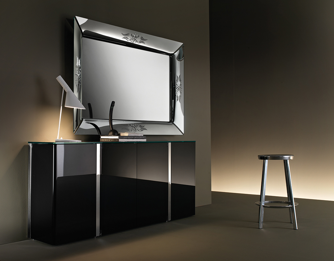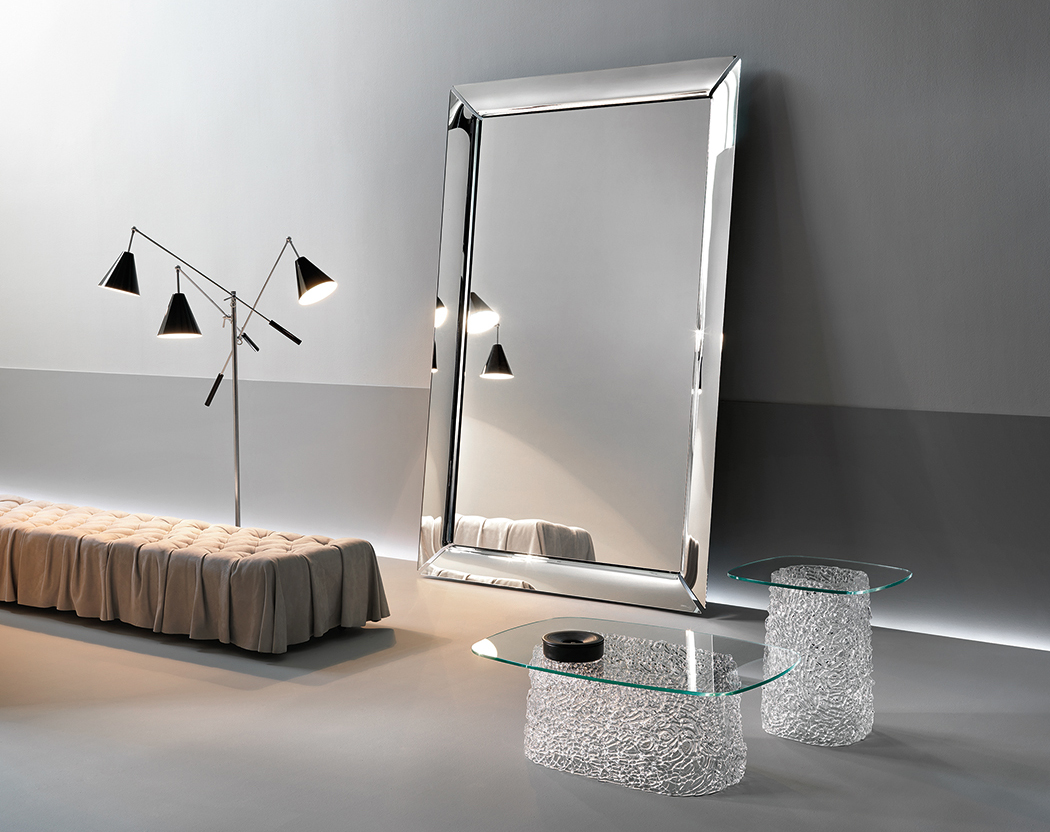 Free-standing mirror, also available in the hanging version (vertical or horizontal hanging), in 6 mm-thick curved back-silvered glass, made of 4 separate elements (neutral version) which are also available with engravings (engraved version) or semi-reflective glass titanium colored 6 mm-thick (titanium version).