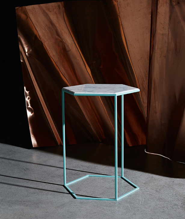A perfect little side companion. The Hexxed table completes the 2014 metal collection which focuses on clean lines, nice details like the hexagon tubing and special finishes.Coming in 2 heights and three color combinations. The powder coated Vintage Copper, Polished Copper and Matt Black are finish with white or black marble tops. Combining the tables in a honeycomb fashion creates an endless coffee table that can even rise and drop when used with the two heights.