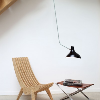 as admirer of Alexander Calder, in 1951 Schottlander created the MANTIS series of lamps. Movement is intrinsic to all of Schottlander’s work : an artist, an engineer and in no small measure a handyman, he devised a clever system of counterweights combined with a series of strong and flexible metal bars. The shade also is unique of its kind.Like an acrobat suspended in midair, it is made from aluminium using spinning and chasing techniques that are a part of the metalworker’s inventory of skills, but to which he has brought his sculptor’s eye to create a helical movement.