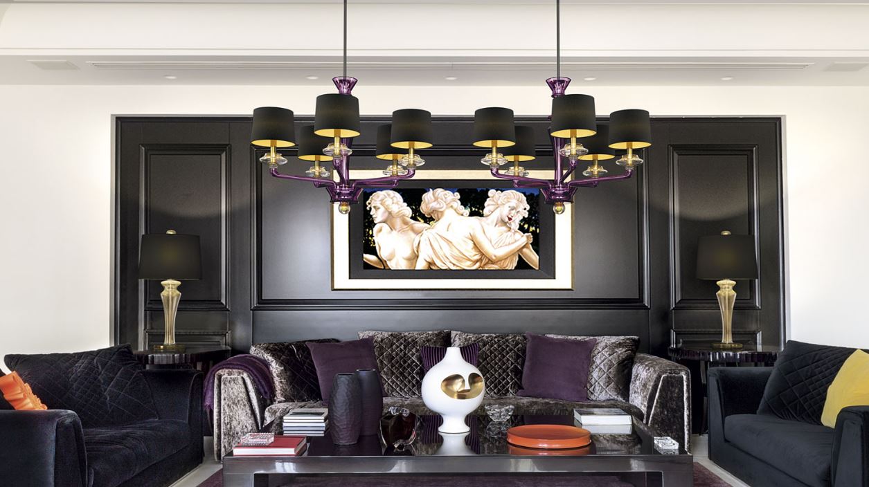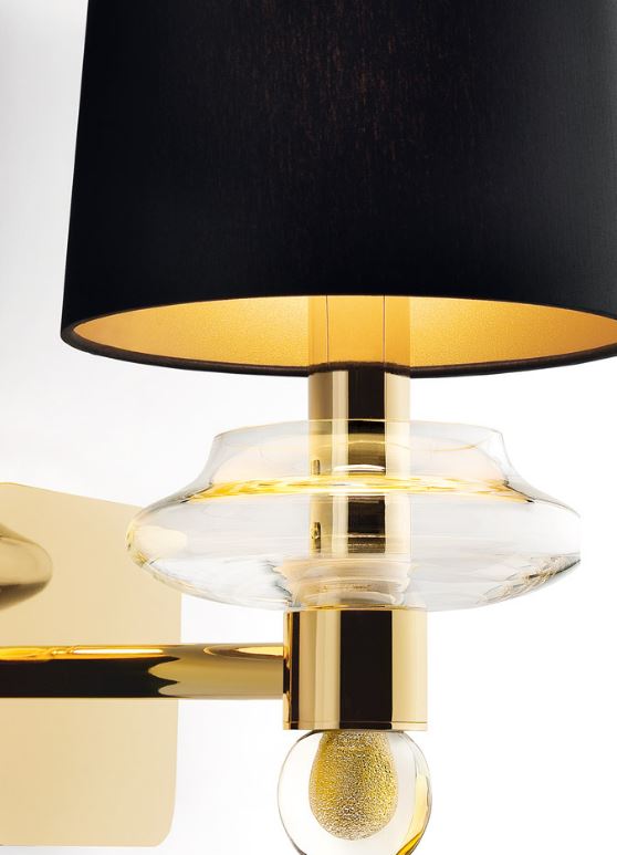 The characteristic of this collection, designed by Giorgia Brusemini, is an innovative chandelier with two lights placed on the same plane, to which are matched other three models, a sconce and a table lamp. Distinctive element is the golden sphere immersed in crystal. The lampshades are black or white. The latter can have a golden inside.