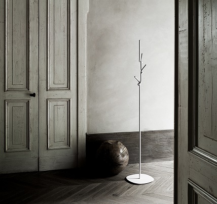 Steel rods softly twist, becoming a coat hanger that goes further the mere functionality and becomes a sculptural object.
