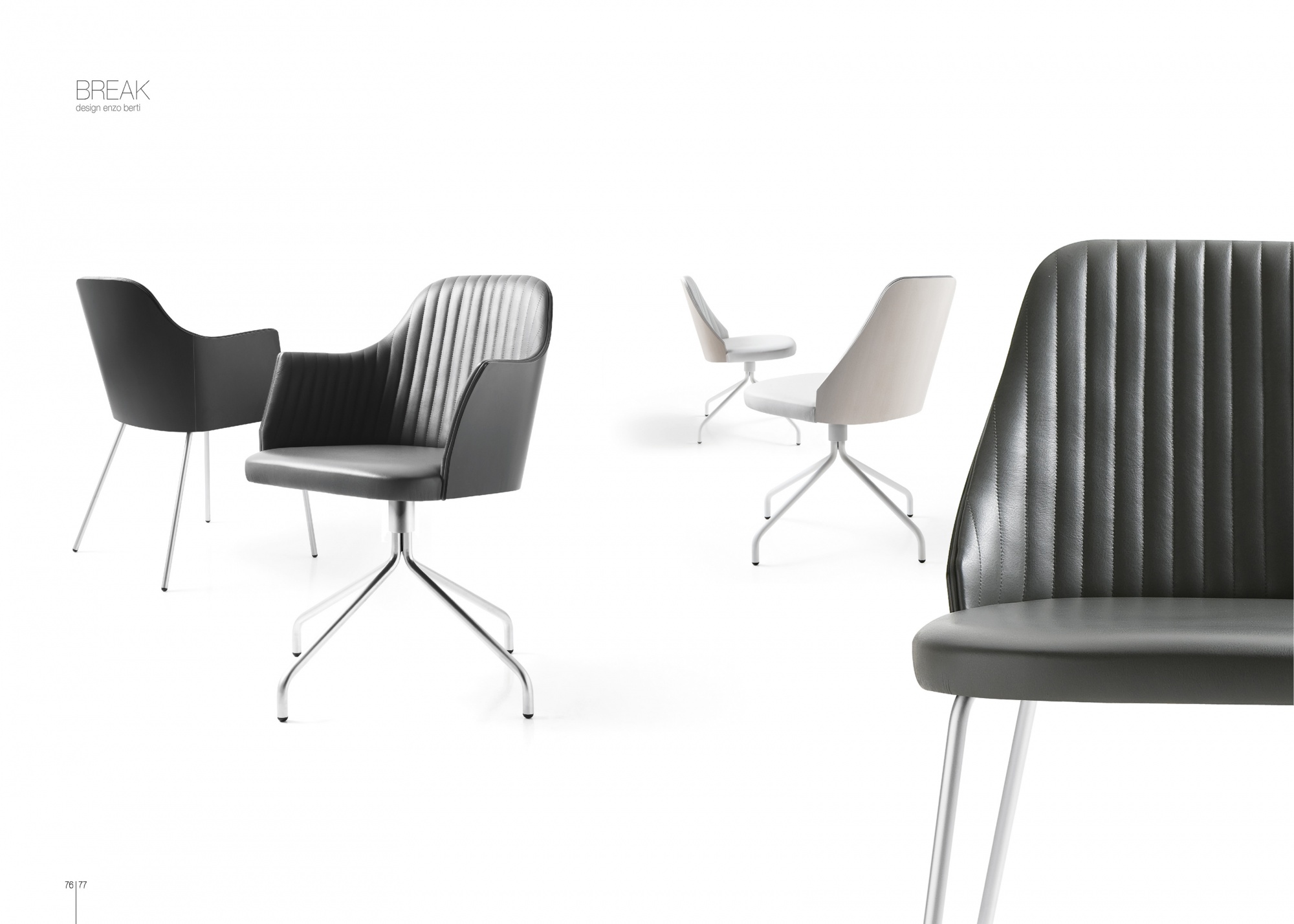 With its sinuous shapes and its distinctive character, BREAK deserves to be listed among the best-sellers of Bross. Its sophisticated design, the embracing and harmonious lines, the love for details, make BREAK a little masterpiece, which can be used for a wide range of projects, from residential to contract, for a sophisticated target with contemporary taste.The collection includes chair and armchair, with wooden or upholstered shell, available with a wide range of metal bases, or wood covered, or a central metal column.The upholstery, in high quality fabric or leather, and the thin vertical seams, create an elegant game of curves.