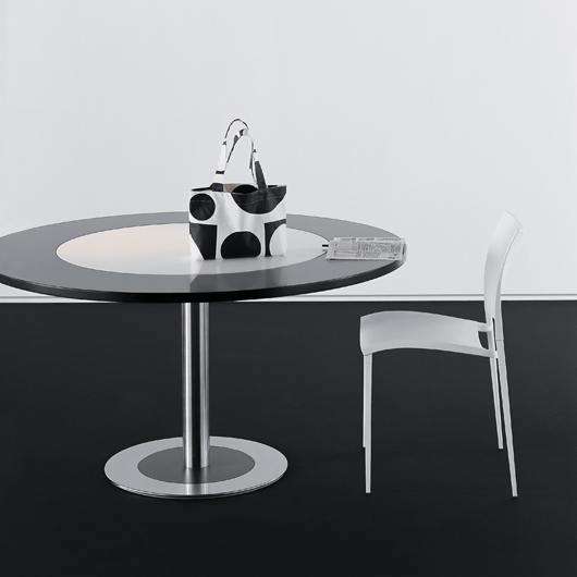 From 4 to 8 places. The external ring transforms the table, enriching both its aesthetic and its functional value. Adjustable wide table with stainless steel frame. Matt lacquered MDF top. Central top and external ring colours can be freely combined. Wall mirror to attach the extension ring. MDF frame in white or black colours.