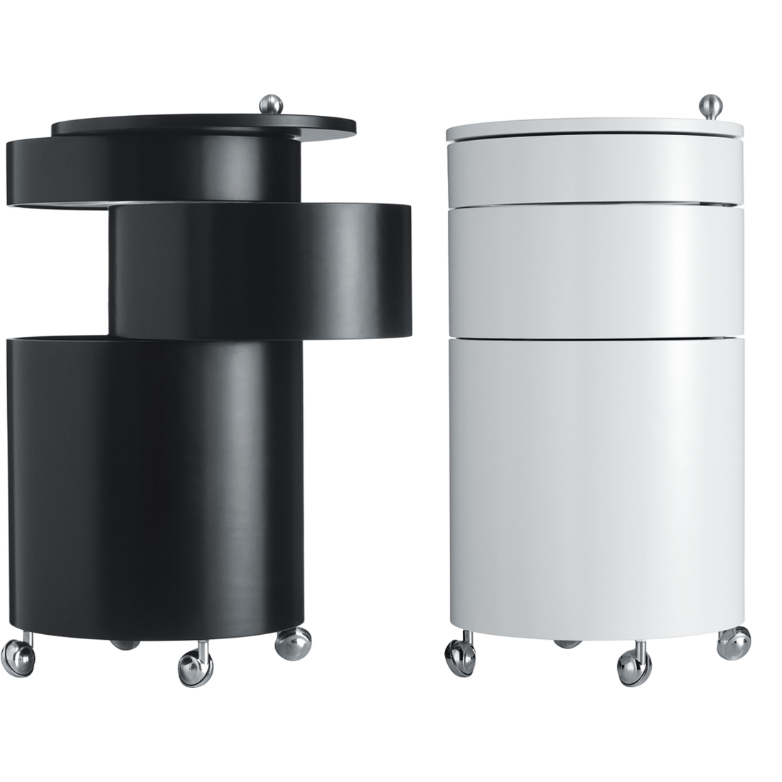 Barboy is a mobile storage piece produced in moulded wood and comprising four cylindrical parts. Two of the elements swing out to function as tables. Verner Panton designed Bar Boy in 1963 when he was living in Basel, Switzerland. During this period, Pant