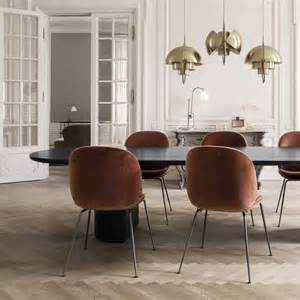 The BEETLE Chair Collection is a chair series in laminated moulded veneer with seat and back in 2 separate parts. The 2 parts are joined together with a steel fitting milled into the 2 shells. The shells are 10 mm thick. The chair is always fully upholstered in fabric or leather.