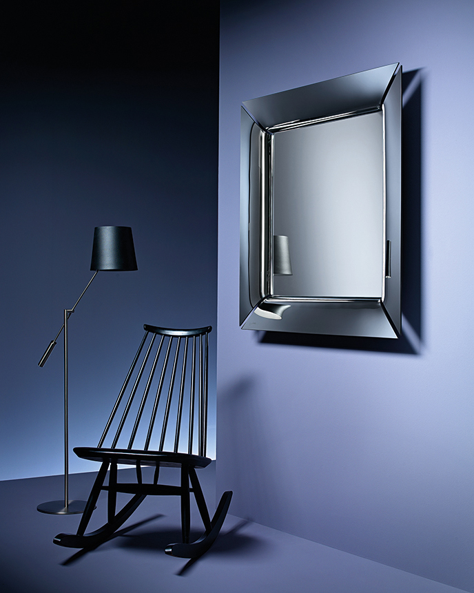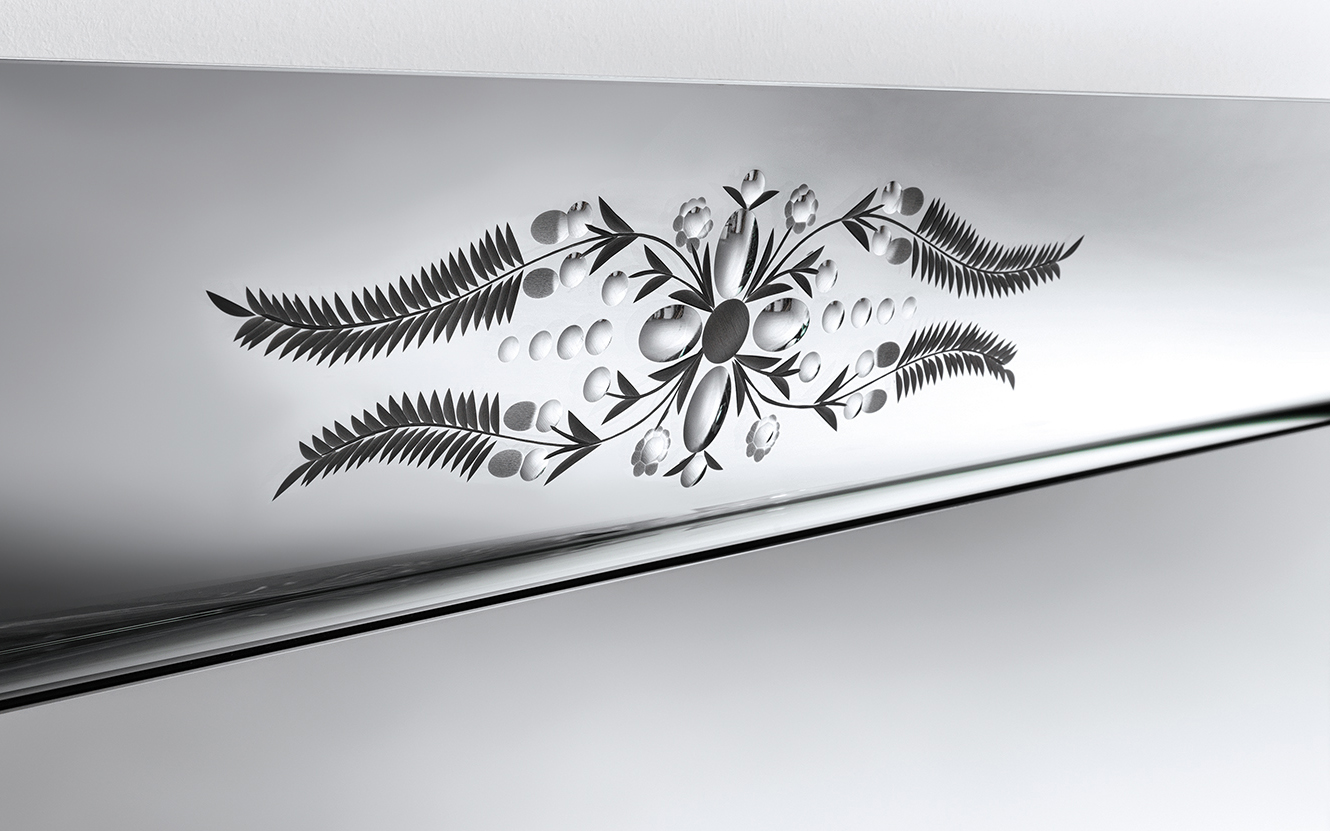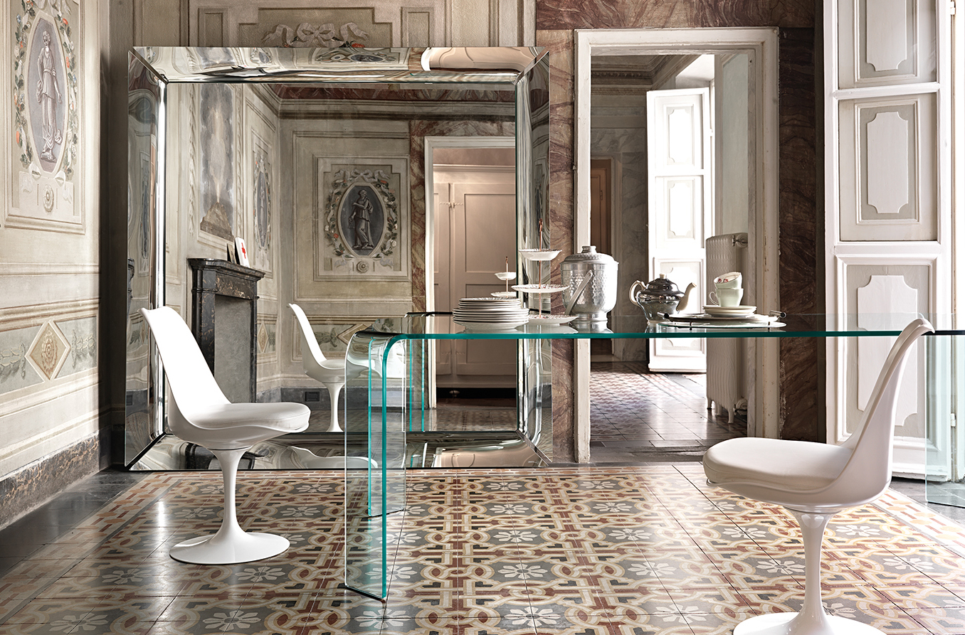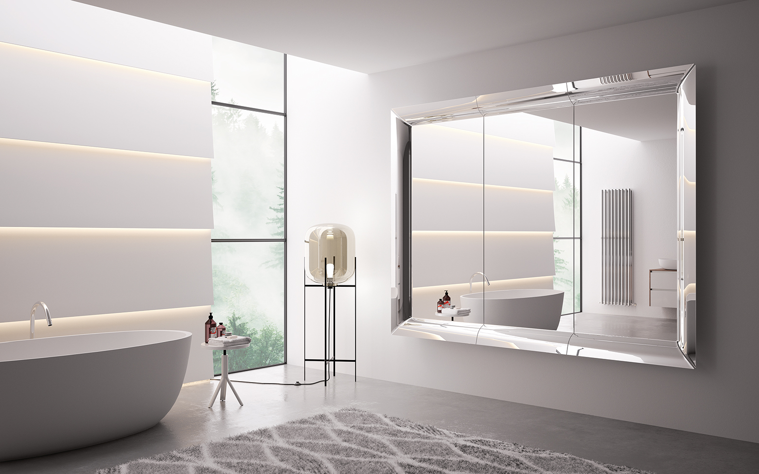 Free-standing mirror, also available in the hanging version (vertical or horizontal hanging), in 6 mm-thick curved back-silvered glass, made of 4 separate elements (neutral version) which are also available with engravings (engraved version) or semi-reflective glass titanium colored 6 mm-thick (titanium version).
