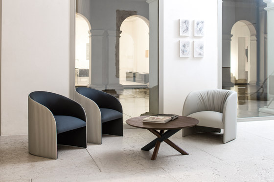 An armchair of embracing forms, which stands out for its refined quilted upholstery of the rear backrest. Fully upholstered in fabric or leather finds its highest expression in the monochrome version, while becoming more casual according to the colour and cover used. Ideal to complement relaxation areas, waiting rooms, reading rooms, lounges or simply conversation-living areas.The ECLIPSE collection is completed by the lounge chair, that is characterized by more generous proportions and a lower back height. The structure, made from a single piece of wood, combined with the elegant folds of the leather, that enrich the backrest, create a timeless object, a bridge over modernity and classicism.