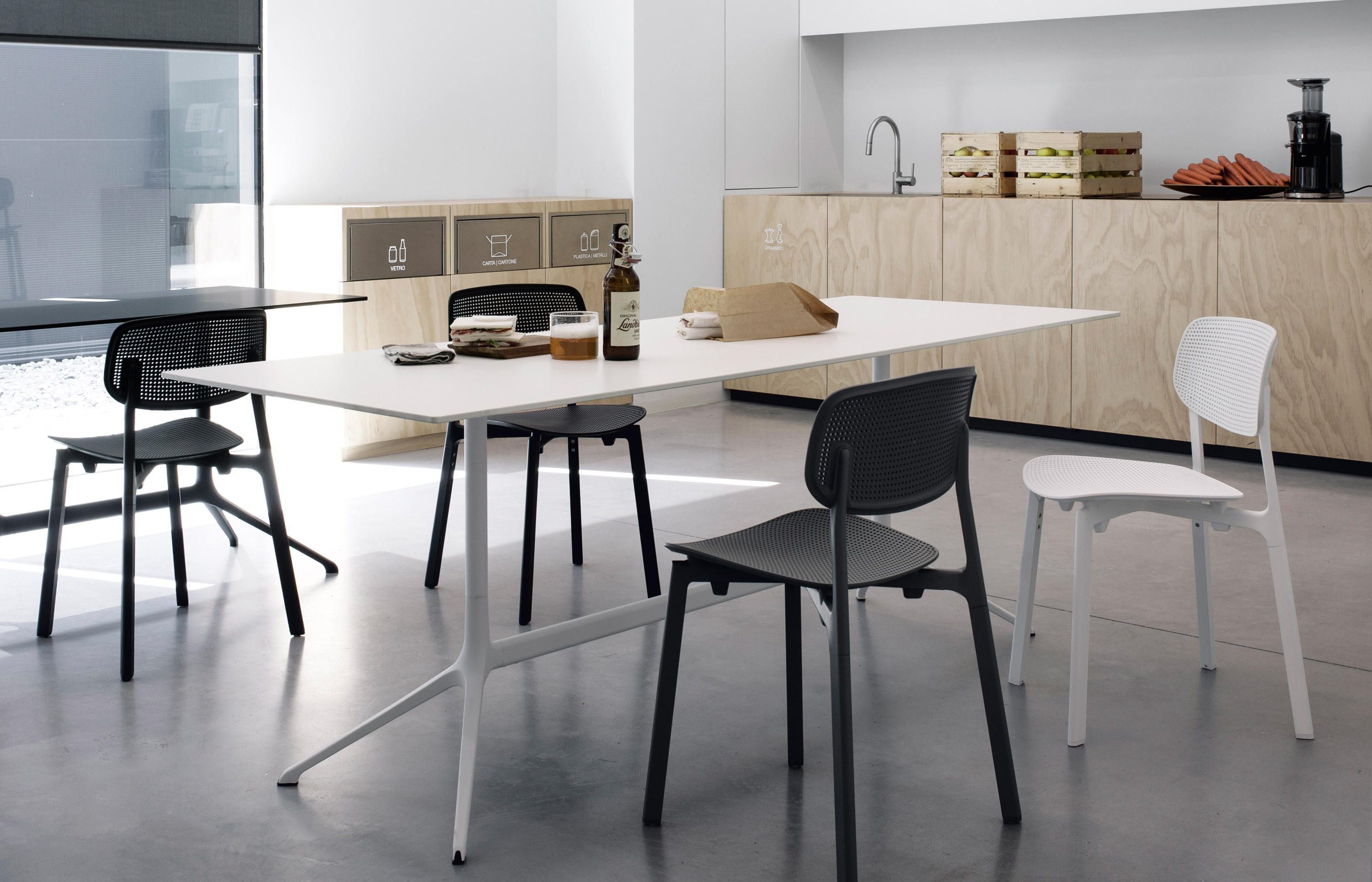 The collection of Elephant chairs, with their characteristic structure inspired by the shape of an elephant’s back, is enhanced with a new item: the bistrot table. Based on the trestle base of the swivel version, in polished or painted pressure die-cast aluminium, it supports a thin round top. The idea has been extended to also include a version with a double base and a rectangular top. Versatile Elephant tables are available with tops in different colours, either fixed or folding, to suit the most diverse needs and contexts: the home, the office or contract furniture projects.