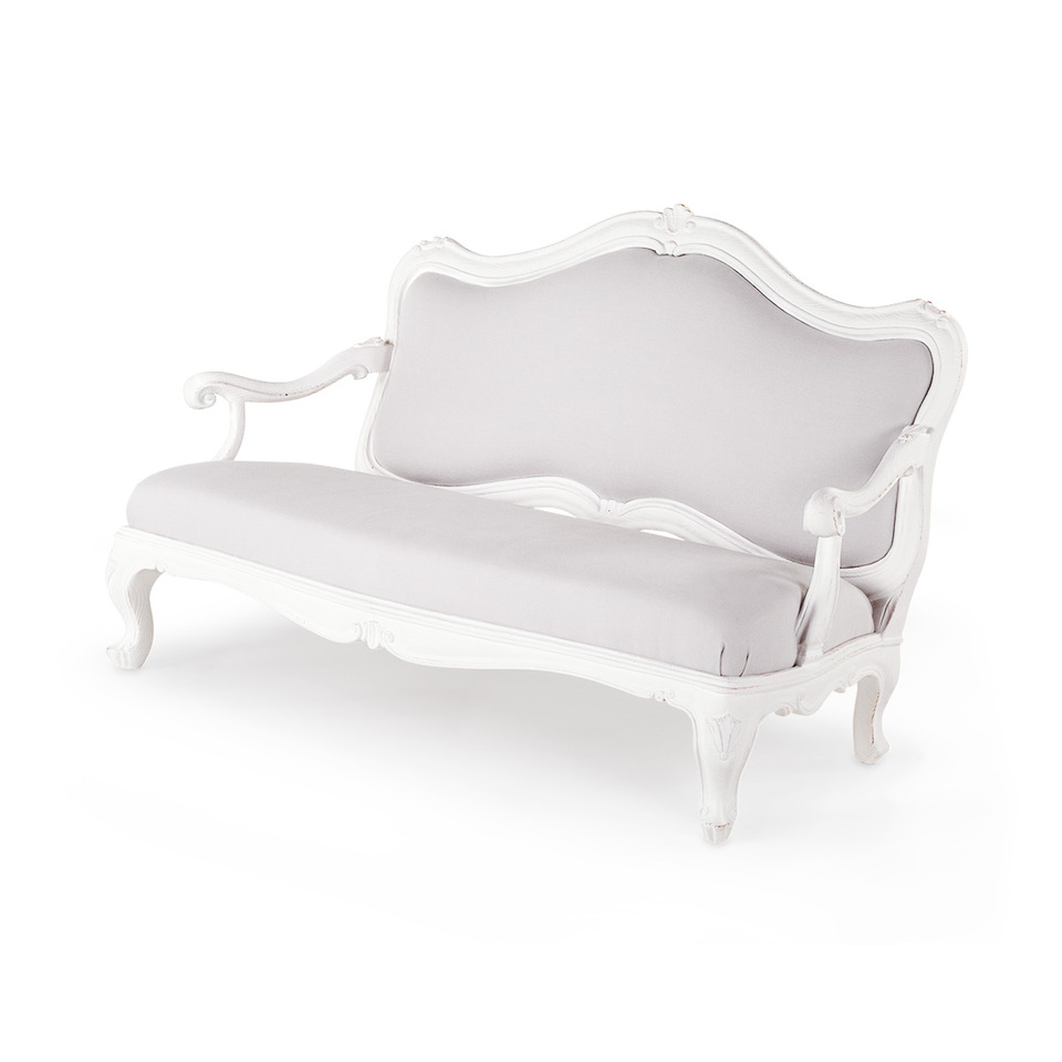 Settee with padded seat and back, frame in solid lenga wood, carved and hand-brushed.