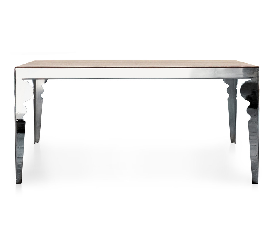 Rectangular moulded stainless steel table, mirror-like polished. Solid oak sandblasted top.