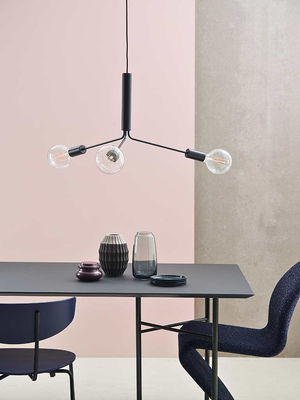 The Grand Metro - a beautiful, unique and incredibly stylish hanging lamp in matt black metal. Combine with three decorative lamps and place over the coffee table, in the kitchen or why not in the bedroom? This lamp works in any room!Cord Length: 250cm, black fabric cable.Light sources (3st) are not included.