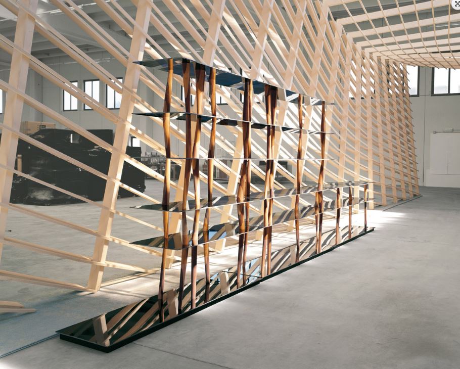 Movement and flexibility summarize the emotional power of Toyo Ito, who in this sculpture-bookcase captures the design essence of Sendai’s media centre (Japan), which he designed and used as inspiration. This leap in scale consists of six light shelves connected through turned elements of solid wood, all different from each other in inclination and section. Sendai is definitely a piece of furniture of silent albeit captivating design, which reflects the typical oriental philosophy of the great architect.