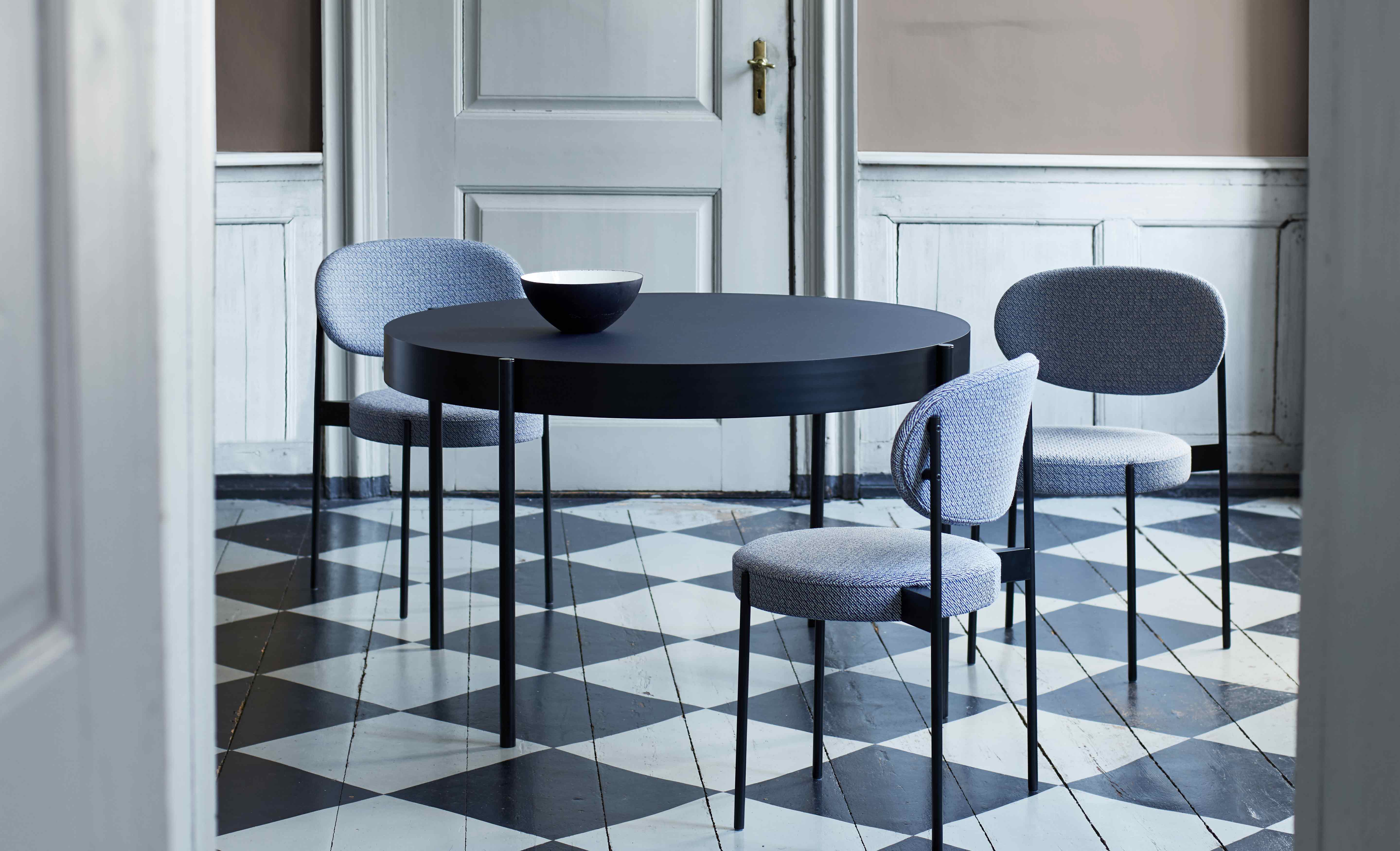Round dining table with obvious frame. Legs placed outside the frame of the table Material Table top and side is made of MDF with linoleum on top. Black lacquered edge on a frame, made of powder coated steel tube diameter off 30mm.