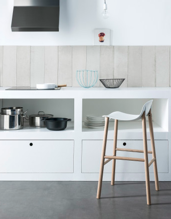 Stools available in two heights with seats in different shapes with wood legs.
