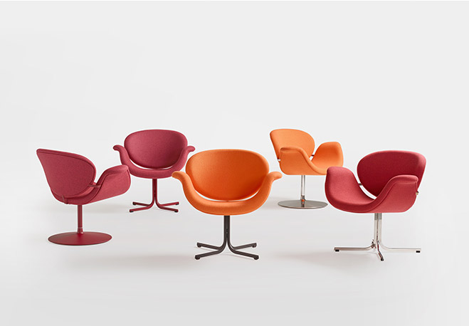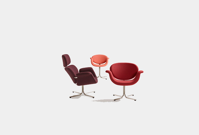 The Tulip Midi was the missing member of the Tulip family for a long time. The armchair was designed by Pierre Paulin in 1960 and now completes the series. In terms of its dimensions, this midsize armchair is the perfect equilibrium between the Little Tulip dining chair and the large Tulip armchair. The Tulip Midi, at the time known as 'F549,' has a cross-base and disk-base.