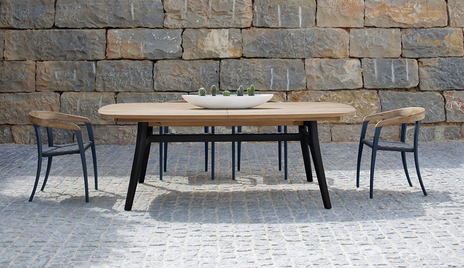 This versatile model can be increased in length from 220 to 330 cm. At its shortest, the table works perfectly for six people. At full size it caters for ten guests. The top is always teak; for the legs you can opt for teak or coated aluminum in white, black or sand.