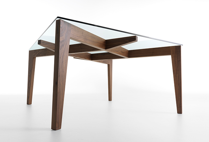 The legs of Autoreggente, apparently slender, lean and fit against each other. The balance of forces expresses movement and instability, but the unity and solidarity of the grid generate power and strength, and the table stands firmly by itself.