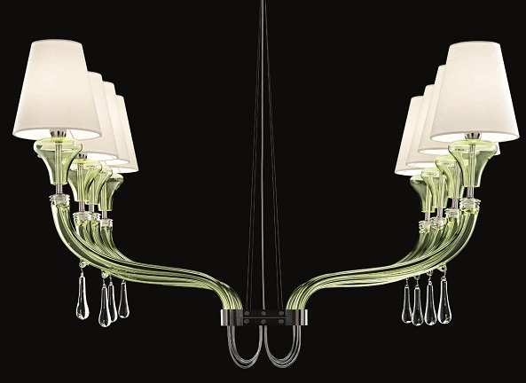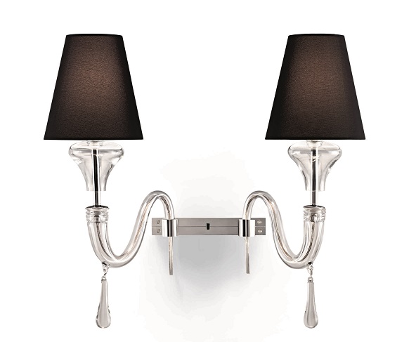 n elegant decomposition of the classic chandelier, reminiscent of a Barovier&Toso chandelier: Maine. Available in three sizes with 8, 12 or 16 lights, with adjustable height. The wall sconce comes with 1 or 2 lights. White or black shades, chromed metal parts and transparent electrical components.