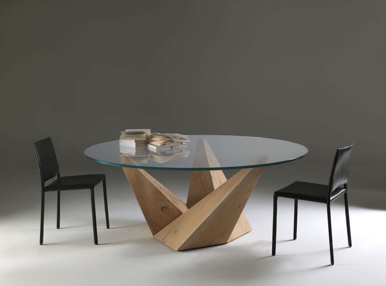 A round table with a strengthned glass top, supported by a structure in cedarwood worked with technologically sophisticated 5-axis machines.
