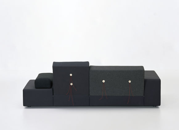 In the home country of Dutch designer Hella Jongerius, the word 'polder' refers to tracts of land that have been reclaimed from the sea by means of dykes and drainage canals. With its flat surfaces and horizontal emphasis, this low-slung sofa evokes features of the polder landscape. Hella Jongerius selected coordinated colour combinations and fabric types for her sofa, accentuating them with high-tech thread and large buttons made of natural materials.
