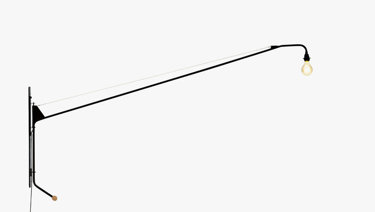 Designed as a pivoting wall lamp for the 'Maison Tropique', Potence is regarded as one of Jean Prouvé's puristic masterpieces. The fascination of this luminaire, which is over two metres long and dimmable, stems from the spareness of its materials and forms.