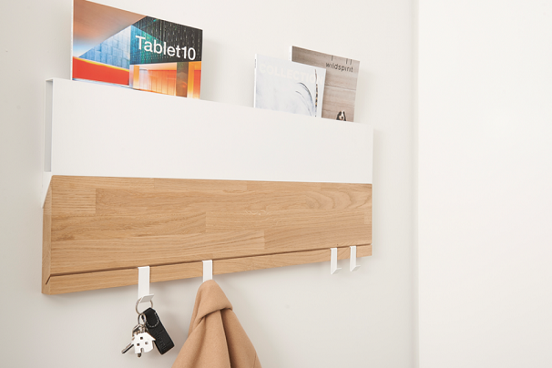 Rack' is a magazine and book holder based on the french cleat system, a mouting technique mostly used in wood workshops. The simple construction the rack results in a clean looking and straightforward design.