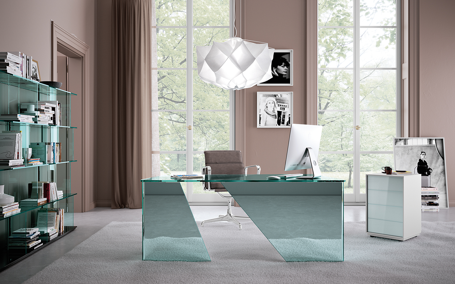 Desk composed of two 12mm curved glass bases and a glass top 12mm thick, transparent or with stand blasted sections.