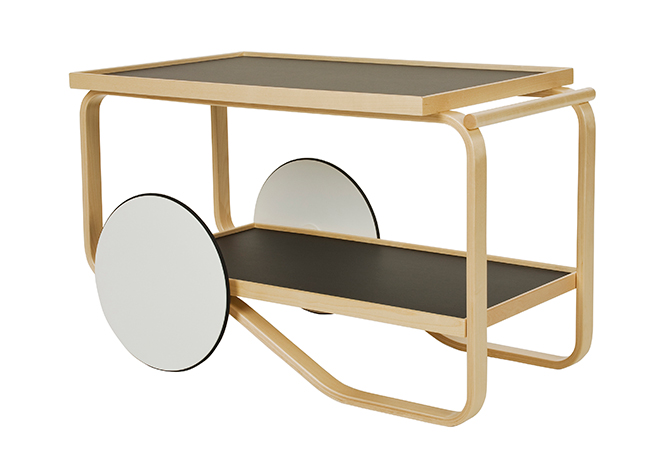 Alvar Aalto originally created his tea trolley, which has now become a design classic, for the World Exhibition of Paris in 1937. The tea trolley gets its typical look thanks to the bent birch frame, the big plywood wheels, the hand-made rattan basket and the table's ceramic surface. Aalto designed the tea trolley for home use and in fact it can be found also in the living room of Villa Mairea, the villa designed by Alvar Aalto.